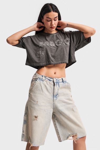 İTS BASİC Kadın Tint Kot Rengi Lazer Detaylı Midi Boy Skater Denim Şort