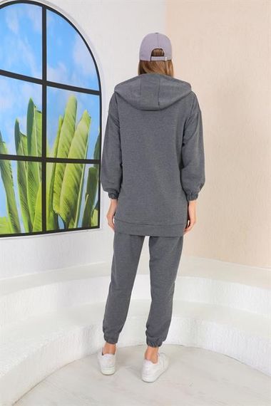 HAZELİN Women's Gray Hooded Printed Fleece Top Crop Undershirt Tracksuit Set HZL23W-BD1553971