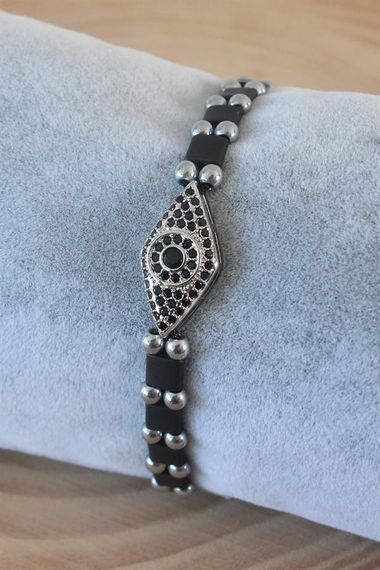 Aymood Siyah Gümüş Renk Zirkon Taşlı Makrome Doğal Taş Erkek Bileklik