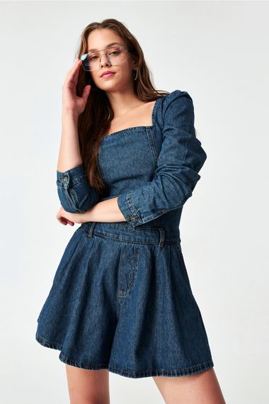 İTS BASİC Women's Tint Denim Color Long Sleeve Denim Shorts Jumpsuit