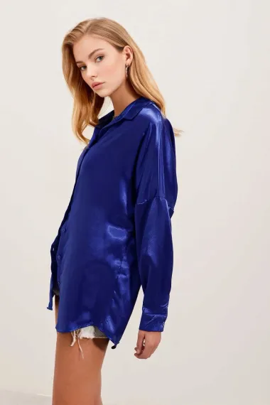 HAZELİN Женская оверсайз рубашка из сатина яркого синего цвета, мягкая текстура, округлый край, размеры 36-44